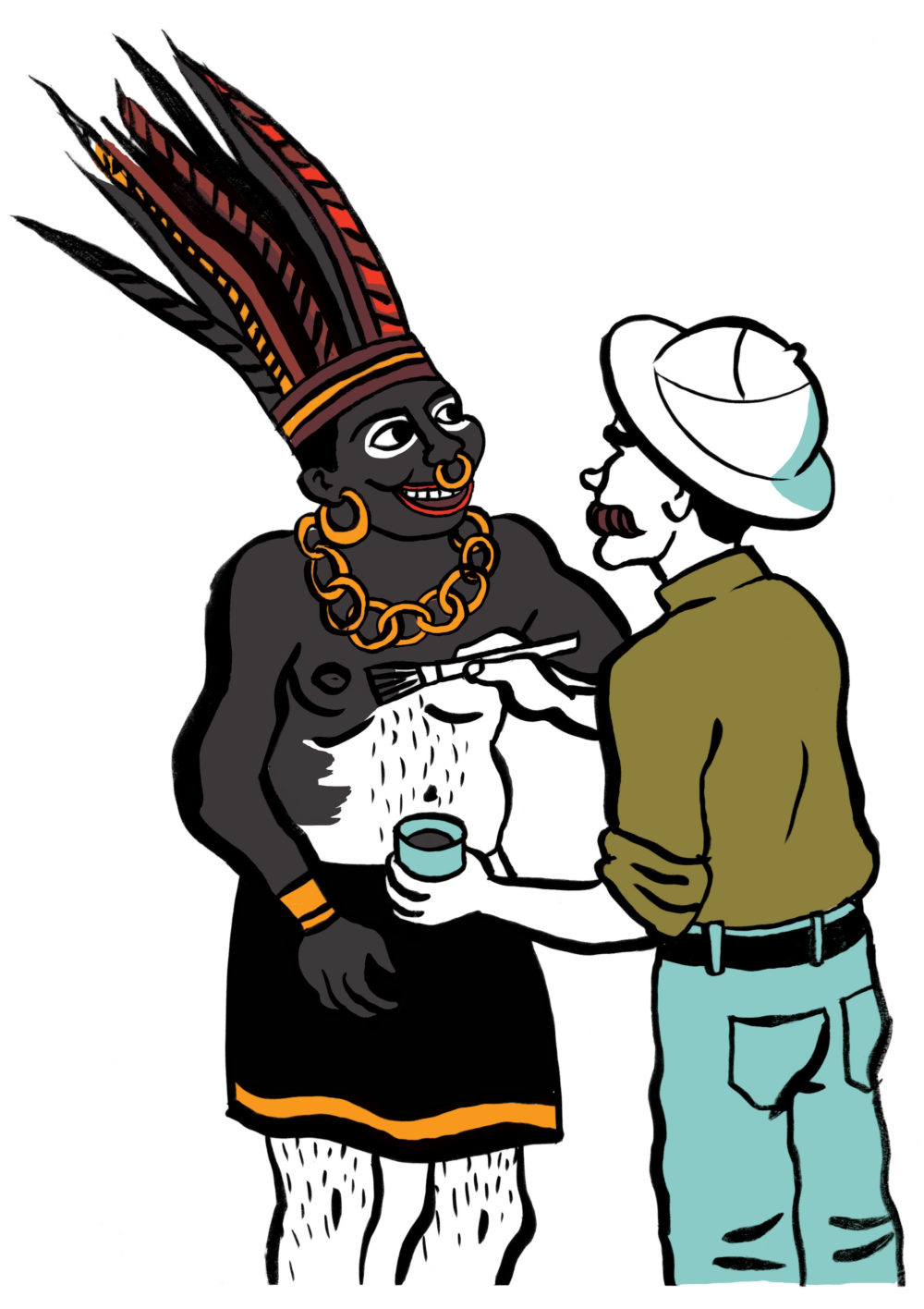 En Belgique, à chaque fois qu’on a des vieilles représentations concernant les personnes afrodescendantes dites « africaines », elles trouvent leur source à 80 % dans l’histoire coloniale. Pourquoi ? Parce que jusque 1960, la présence noire sur le territoire de la métropole belge est presque inexistante, contrairement à d’autres empires comme l’Angleterre ou la France qui ont accueilli très tôt sur leur territoire des étudiants issus des pays colonisés — dans le but de former une élite maniable pour continuer à dominer. Dès lors, les représentations des Noirs à disposition en Belgique provenaient essentiellement de la colonisation. La Belgique a toujours eu peur du métissage. Une peur que l’on retrouve inscrite aussi profondément dans ces folklores exotisants et racistes qui semblent être les seules démonstrations de la culture africaine qu’on a gardées et qui sont devenues à un moment la représentation de l’Autre au sens large.