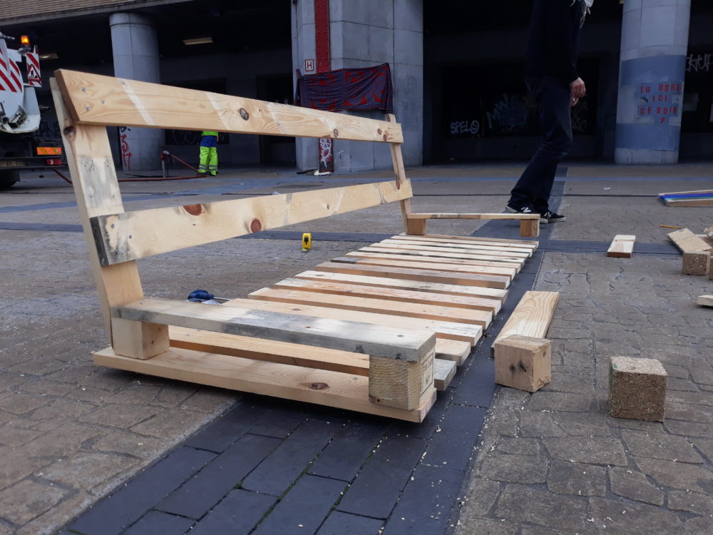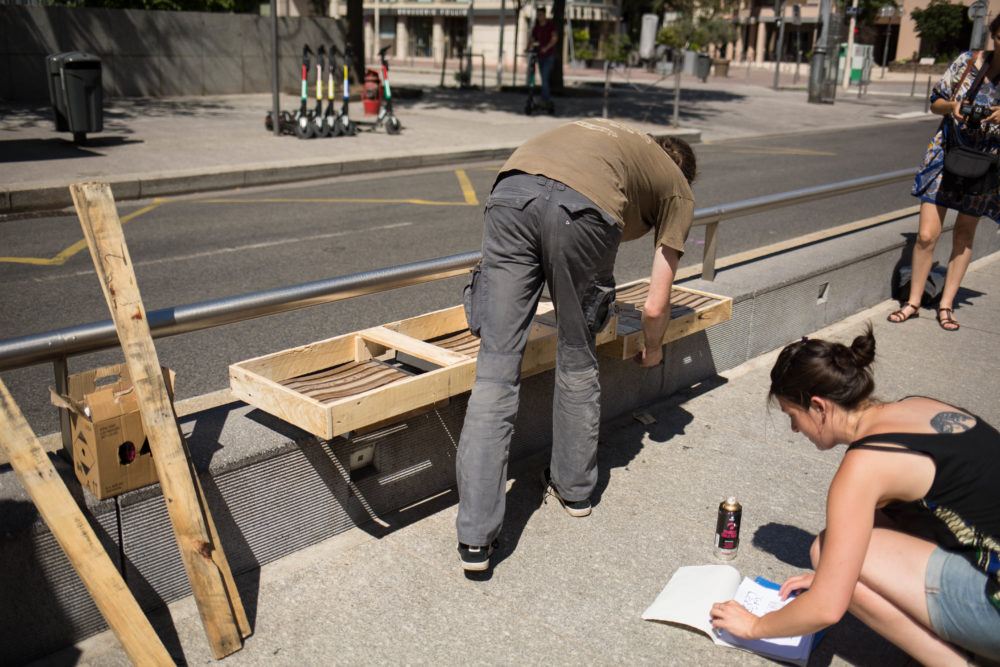 Si certaines de nos interventions ont été préparées et construites en toute discrétion dans des caves ou des garages, d’autres ont été construites lors d’ateliers participatifs dans l’espace public. La conception et la réalisation des structures sont alors l’occasion d’échanges et de partages avec le public en cohérence avec notre souhait de questionner l’aménagement urbain. A contrario, l’installation en elle-même se doit d’être faite le plus rapidement possible au risque d’en être empêchés.