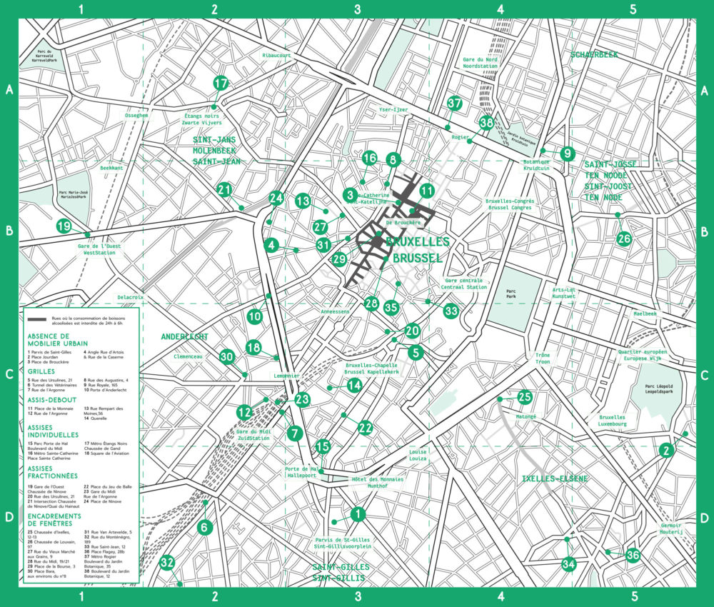 Grilles, pics, herses, assises individuelles ou fractionnées et, plus insidieusement encore, bacs ou pots de fleurs, les dispositifs et pratiques visant à réguler les usages de l’espace commun voire à en exclure certains usager·ères sont multiples. Les interventions que Design for Everyone a commencé à mener dans l’espace urbain bruxellois en 2018 avaient pour ambition de rendre visibles ces pratiques et de les questionner publiquement. Le constat est sans appel. Ces traces d’un design hostile, qualifiées d’architecture du mépris par certains auteurs, sont nombreuses. Et le signe tangible d’une ville voulue « propre », nette » et « sûre » qui se traduit dans les faits par « régulation », « exclusion », « contrôle », taillée sur mesure pour les échanges commerciaux et les flux productifs. On cherche parfois en vain des espaces de convivialité et de gratuité qui, sans être exempts de conflictualité, permettraient la rencontre et les échanges entre les habitant·es et usager·ères d’un même espace.