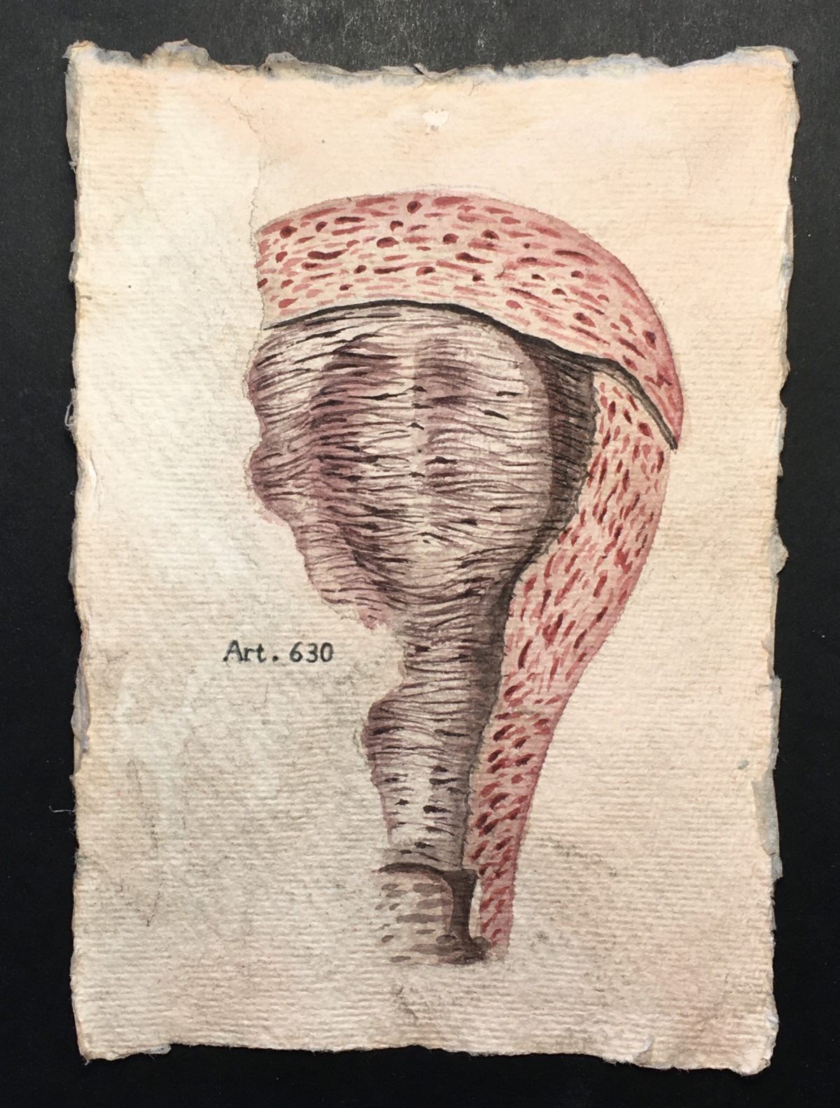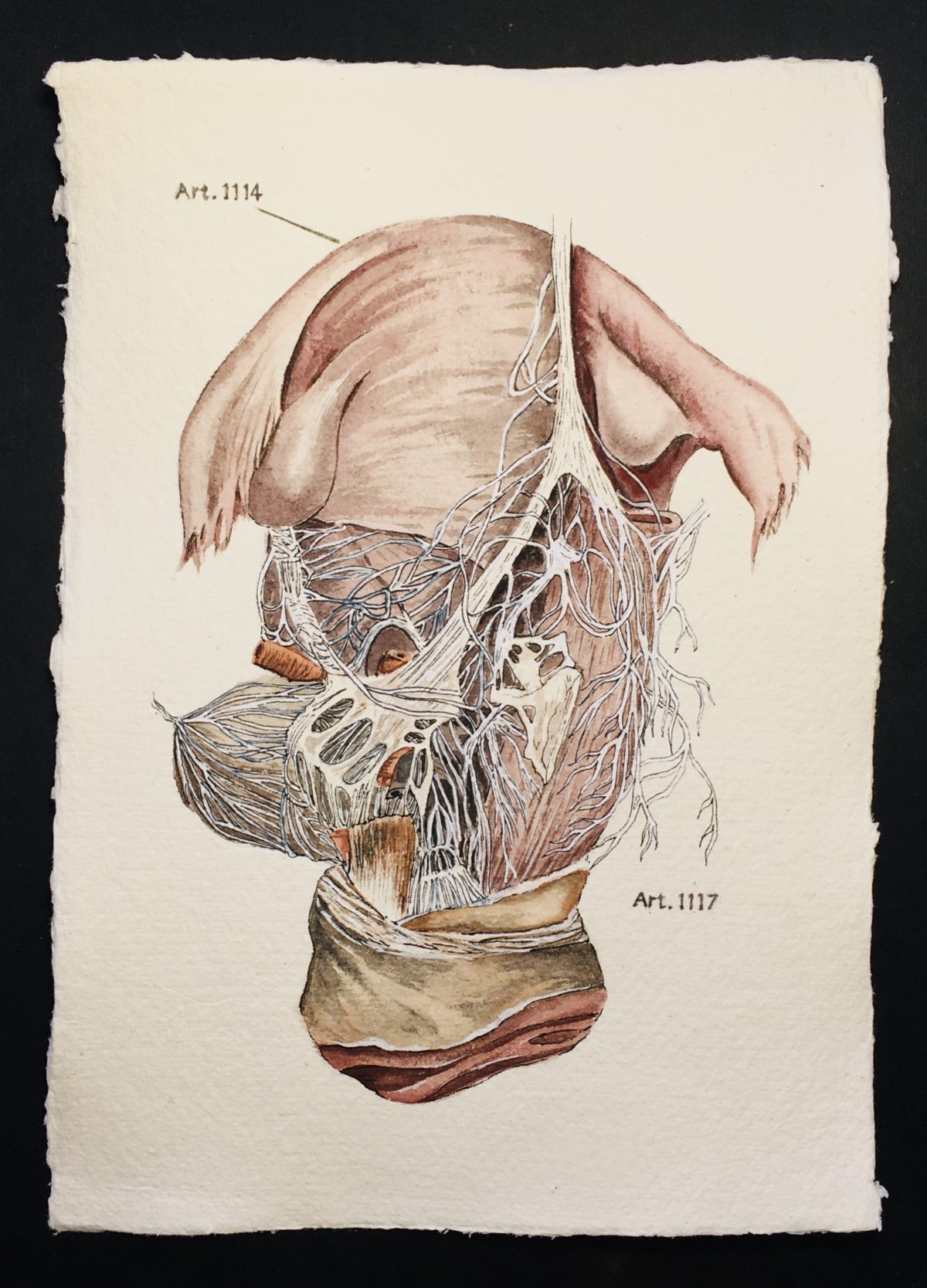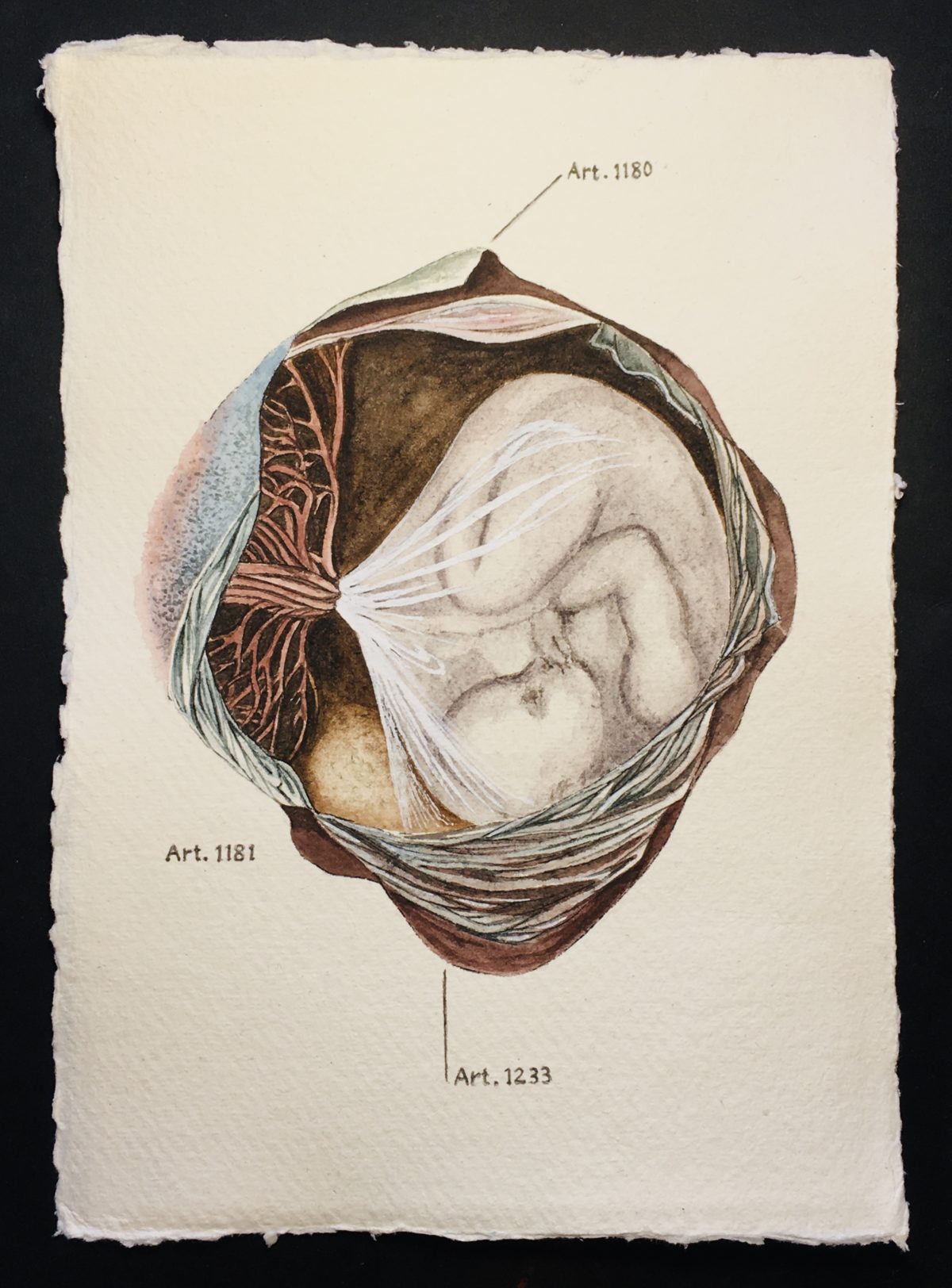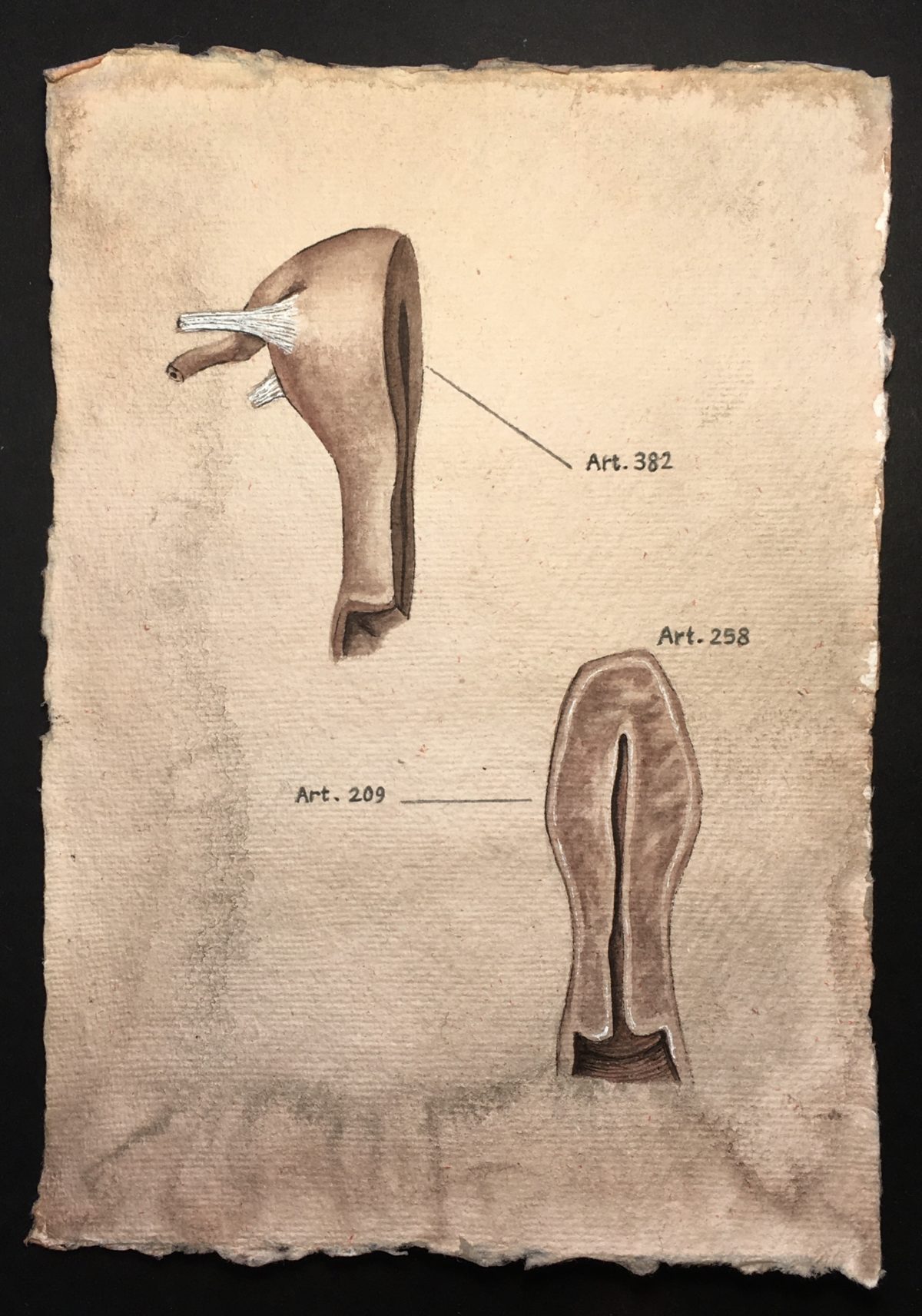 À travers une série de dessins représentant l’anatomie de l’utérus, l’artiste iranienne Nikoo Nateghian, qui vit et travaille à Bruxelles, nous plonge dans les méandres des lois oppressives iraniennes. Chaque détail anatomique renvoie à un article de loi, soulignant ainsi la manière dont le système juridique peut être utilisé pour opprimer et contrôler les femmes en Iran. Ce projet, intitulé « Dévitalisation », explore ainsi la violence insidieuse qui touche les femmes iraniennes émanant des systèmes législatifs qui violent leurs droits fondamentaux. La représentation anatomique de l’utérus que l’artiste confronte à ces textes agit comme un moyen de neutralisation et de désensibilisation de la perception de cet organe féminin puissant et sacré. Les articles de loi, avec leur langage juridique impérieux, interviennent pour perturber cette contemplation paisible. Ils déconstruisent la connaissance acquise par l’observation des planches anatomiques, révélant ainsi la manière dont ces lois contribuent à la dévitalisation des femmes en Iran, en les réduisant à de simples cas à traiter par le système judiciaire.