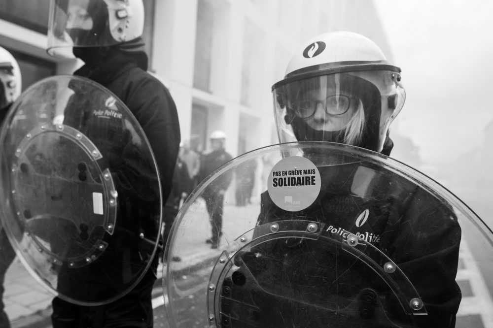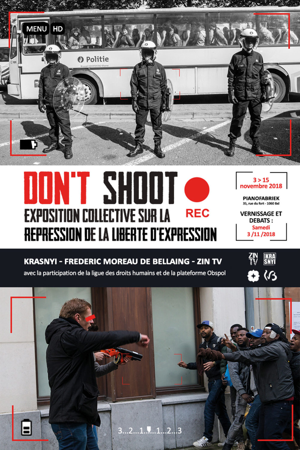 se détériore. « Don’t shoot ! » s’est donnée un double objectif : nous inviter à réfléchir sur notre faculté collective à pouvoir témoigner de l’action policière et de mettre en lumière la criminalisation croissante des mouvements sociaux. Ce projet est porté par ZIN TV, le photographe Frédéric Moreau de Bellaing, le collectif Krasnyi et la Ligue des droits humains, des partenaires qui partagent une expérience de terrain de plusieurs années à suivre et documenter les luttes sociales en Belgique. Luttes qui doivent souvent faire face à des intimidations, des arrestations et des violences policières.