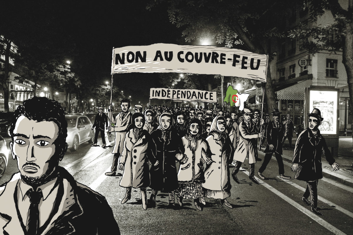 Il s’agit d’un extrait de l'exposition « Ici on noie les Algériens », expo de dessins sur photo réalisée en octobre 2021 par le collectif Krasnyi à l'occasion des 60 ans d’un massacre occulté, celui du 17 octobre 1961. Ce jour-là, plusieurs centaines de manifestant·es algérien·nes étaient massacré·es par la police française et leurs corps jetés dans la Seine. Un sombre épisode de l'Histoire récente très longtemps passé sous silence.