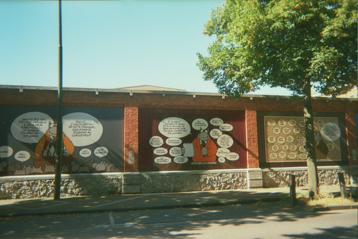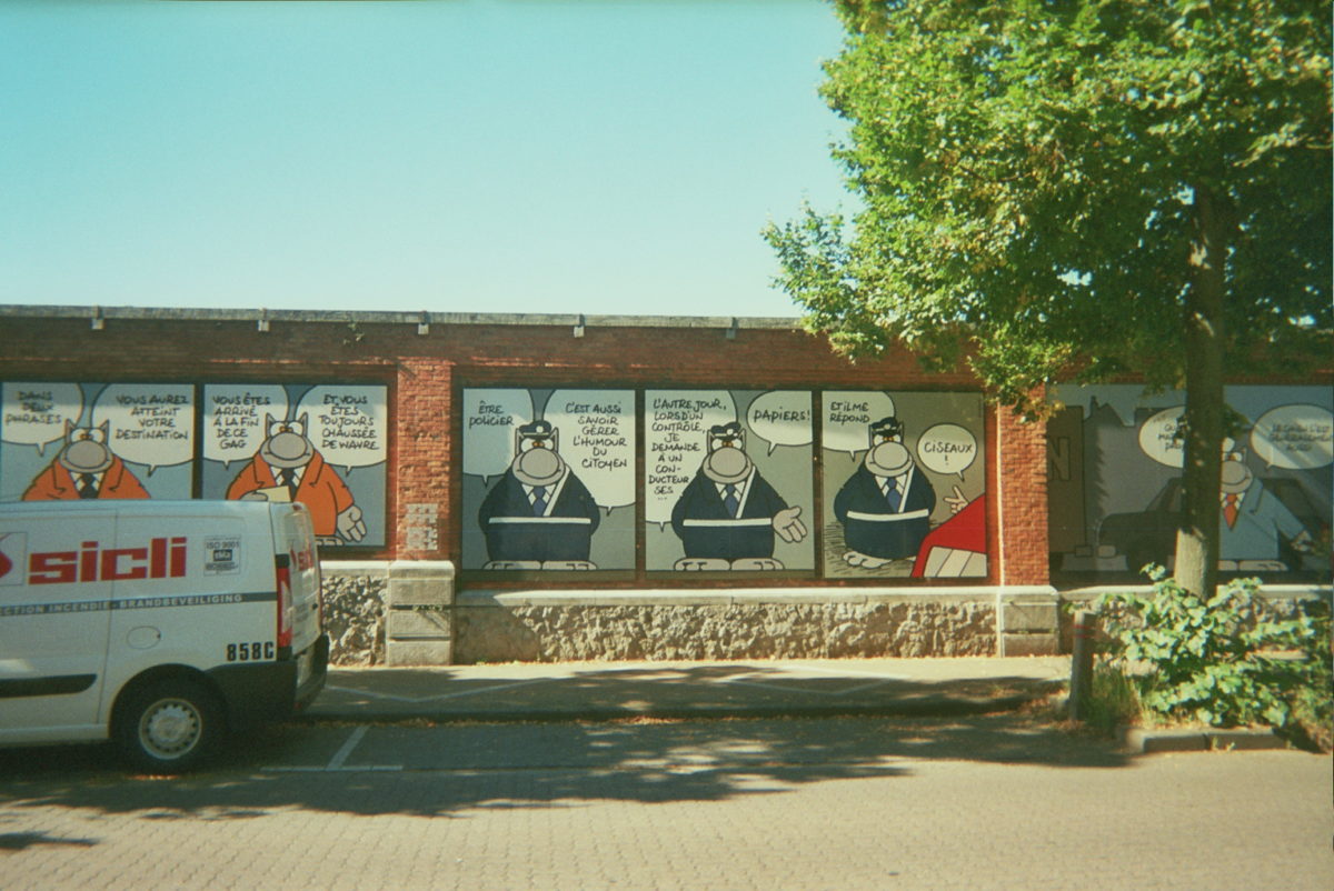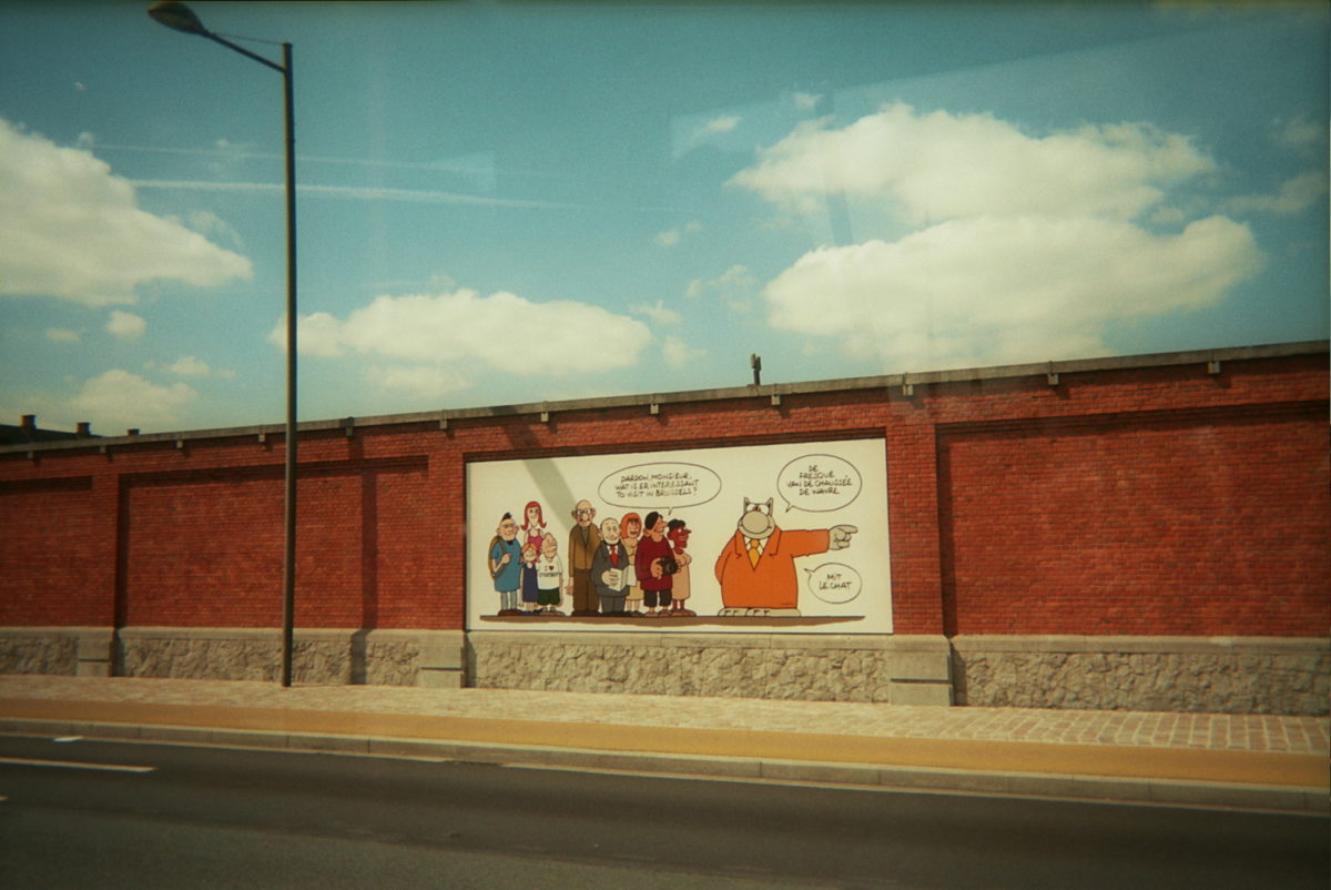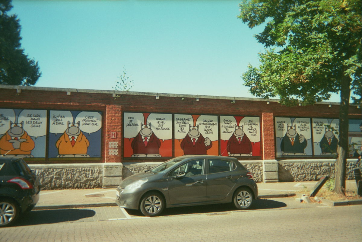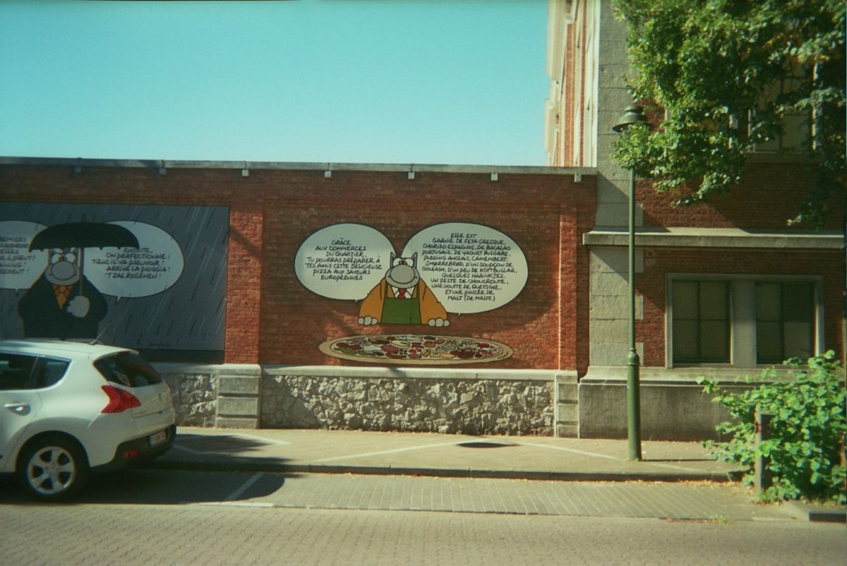 Ce sont des images du "Chat" de Philippe Geluck dans le quartier de la Chasse. C’est un dessinateur assez connu, je le vois parfois venir visiter sa fille qui tient un Tea-room à Bruxelles. Mais je trouve qu’ils ont mis trop de photos sur ce pan de murs. Ça fait trop chargé, et les vannes sont un peu plates. C’est un peu triste de mettre ça là.