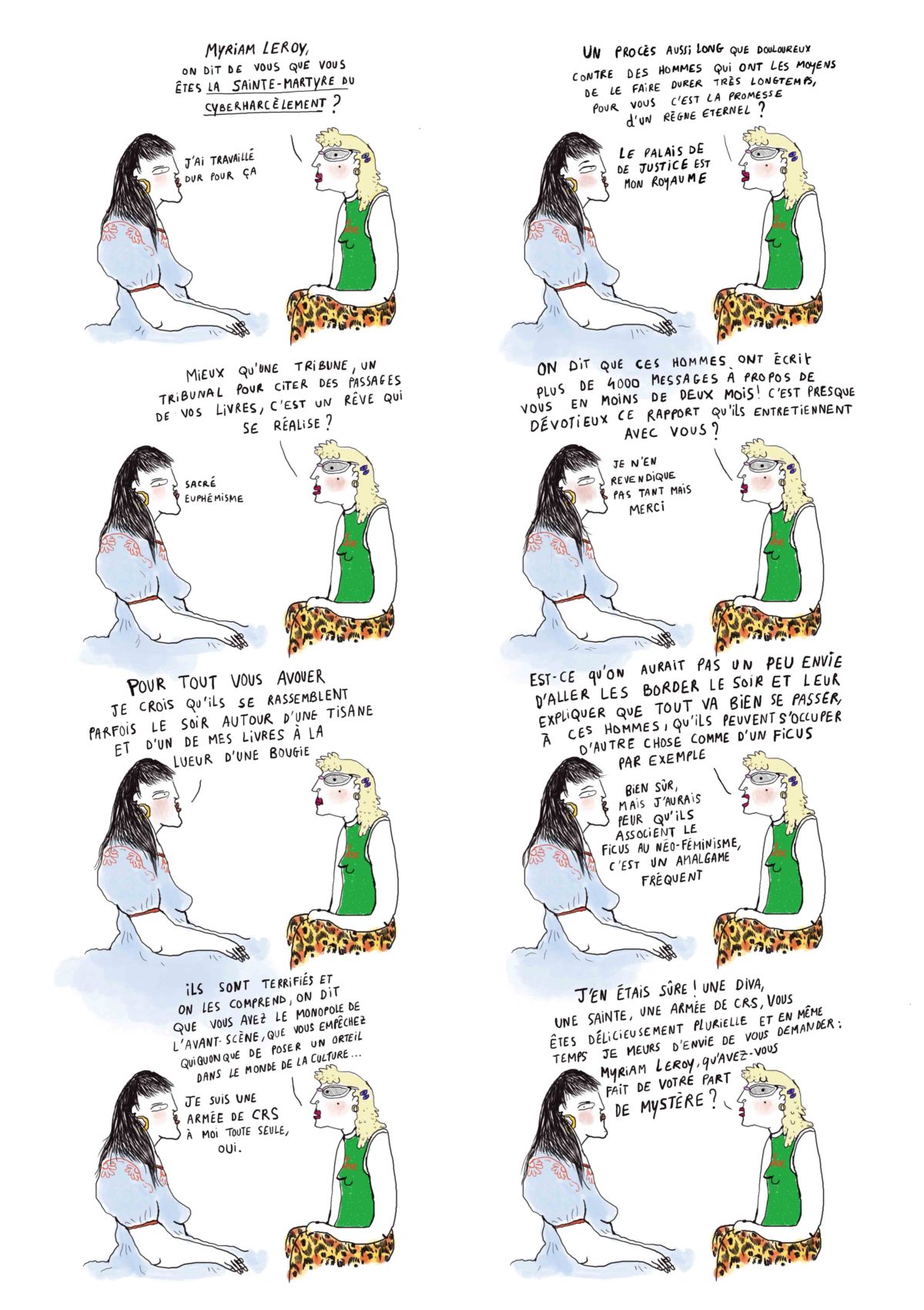 Maurine Larcher, alias RapsodyMorris, reproduit dans cette planche de bande dessinée quelques éléments piochés dans les 4300 messages du groupe de harcèlement. Elle représente un personnage de journaliste qui cuisine un personnage de Myriam Leroy au sujet de ses messages, en paraissant les prendre pour argent comptant, ce qui fait apparaître la teneur insensée des échanges de la « Jupiler League du LOL ». Maurine Larcher propose des univers et des personnages singuliers, qui se jouent des codes traditionnels de la « beauté ».