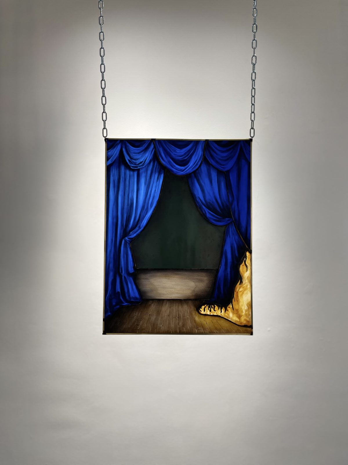 Lior de Pape fabrique et répare des vitraux. Des compositions géométriques, ou des choses plus classiques ou patrimoniales. La voilà à travailler avec sa technique si pure et sacrée un truc aussi nul, glauque et moche que les milliers de messages que s'envoient de gros obsédés du féminisme, du gauchisme et des « journalopes ». L'image qui s'est imposée à elle en parcourant les messages de haine est une scène de théâtre avec de grands rideaux bleus (le bleu Facebook) qui prennent feu à la base. Un théâtre et un bûcher.