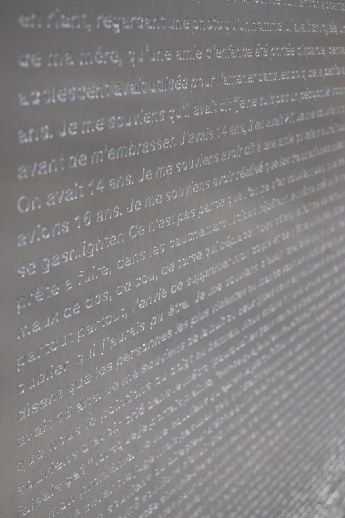 Tout le monde n’a pas été au cœur des préoccupations d’une bande de harceleurs, mais toutes les femmes ont enduré la haine et la pulsion de destruction. C'est ce que tend à démontrer l'œuvre de Loïs Soleil. L'artiste a parcouru les 4300 messages et toute cette boue remuée a fait émerger en elle un texte organique et puissant. Il semble avoir été écrit en un jaillissement, avant d’être gravé et poli avec minutie sur une plaque d'aluminium dont la taille et la pérennité donnent encore plus de poids à cette scansion malade en affirmant « Je me souviens ».