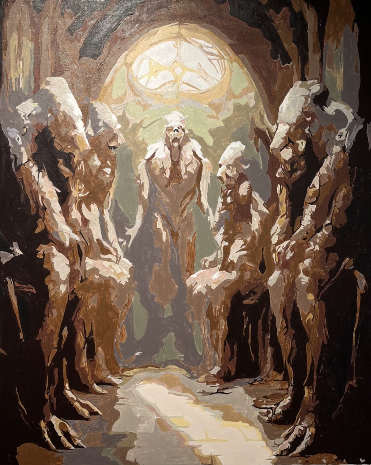 Quand Myriam Leroy a découvert le groupe de harcèlement qui la concernait, elle a demandé à ChatGPT de générer un visage issu du morphing de celui des hommes de la « Jupiler League du LOL ». Il lui sortit une image de gargouilles tapies dans une sorte de crypte. De cette illustration purement numérique, elle a décidé de créer une œuvre analogique. Elle l’a peinte au numéro, à l'acrylique, sur une surface très agrandie, donnant à l'image une esthétique encore plus gothique.