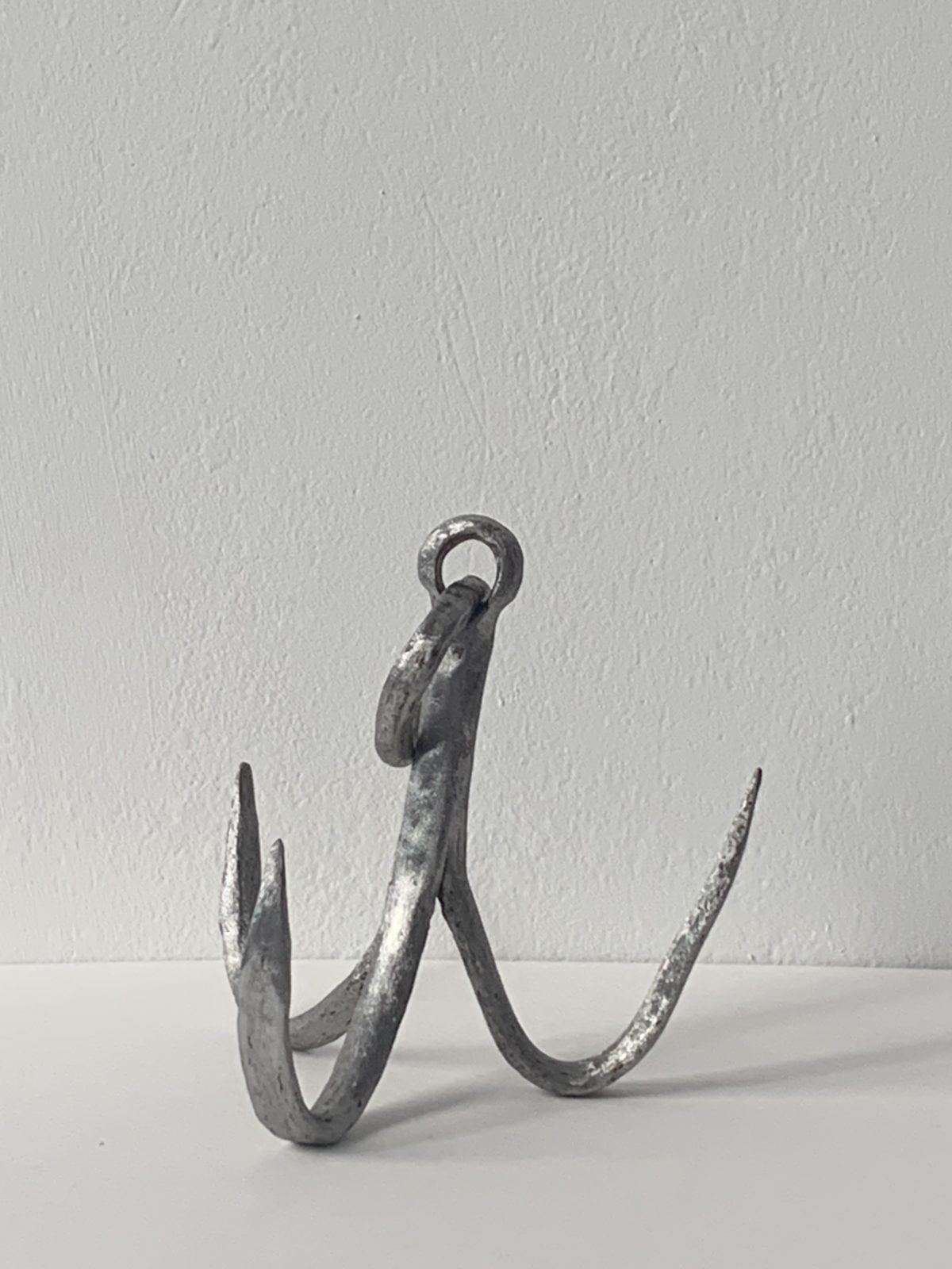 Une installation plus ancienne de Pauline Reyre s’intitulait « Trop de sable pour mon camion » constituée d’un monticule de sable, d’un camion jouet trop petit pour le volume à déplacer et d’une pelle permet aux visiteur·euses de repartir avec un peu d’une matière symbolisant la mise en collectivité du fardeau personnel de l’artiste. C’est aussi ce que Myriam Leroy espère de l'exposition : que chaque artiste travaillant sur les messages en brise le sortilège en le morcelant. Ici, un grappin où l'on comprend l’impossibilité de se dérober à la tête chercheuse hérissée de harpon. Comme internet, face auquel nous sommes à découvert.