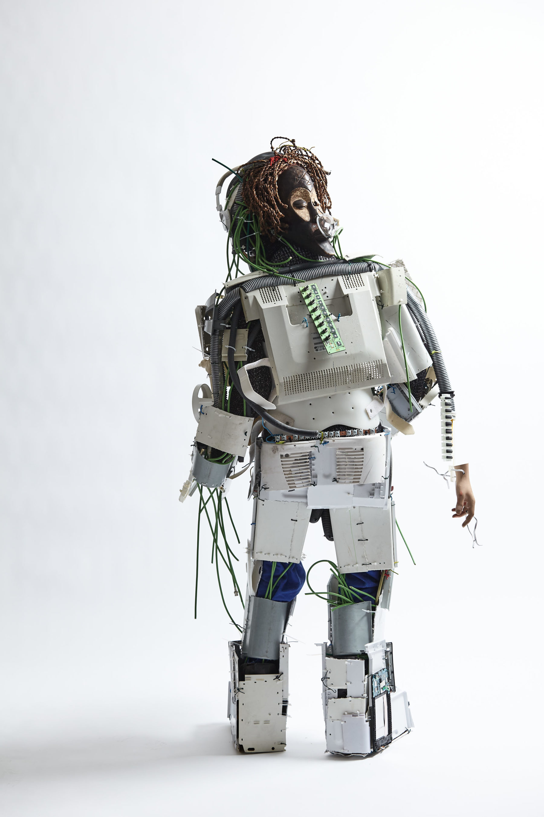 Cette question, il la pose sans mots, sous ses armures de métal et de déchets électroniques, par le simple déplacement de son corps dans la ville, quand il devient un « robot sapiens » : « Quand je suis dans mon costume, je ne suis ni noir, ni blanc, ni homme. C’est seulement lorsque les gens aperçoivent une plaque de voiture avec le drapeau du Congo qu’ils m’identifient comme congolais ».