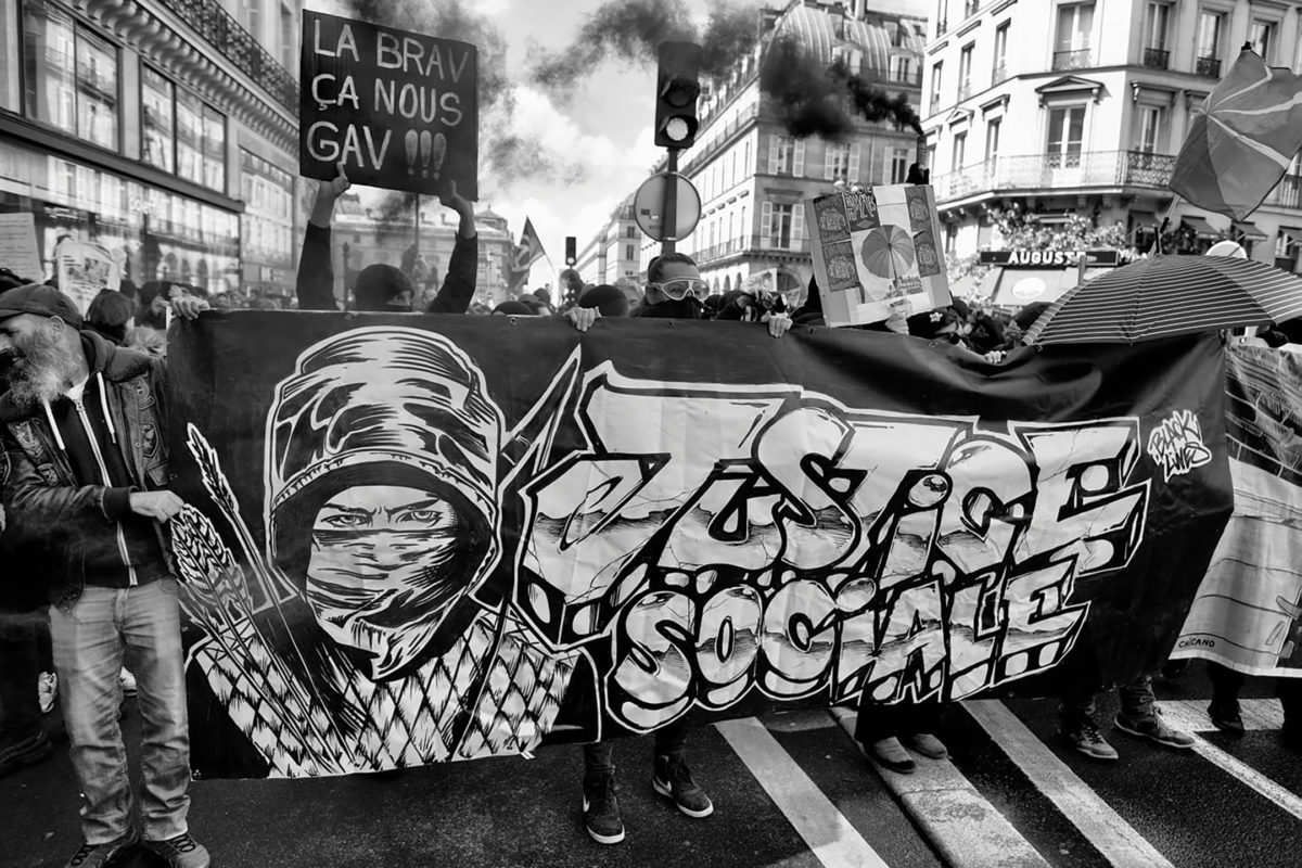 Sur mur ou sur banderole, les street artistes de Black Lines expriment depuis quelques années, en spray noir et blanc, leur soutien aux mouvements sociaux en France. Bien plus que des œuvres sur les luttes, leurs créations font intégralement partie de la contestation qui s’exprime dans la rue.